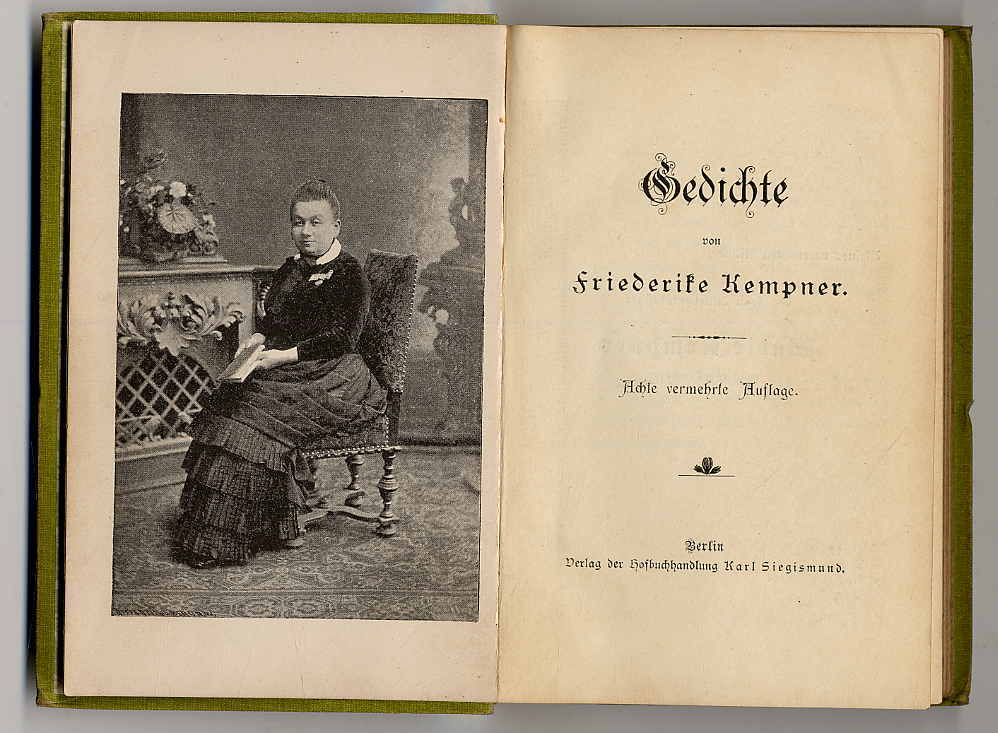 Kempner, Friederike: Gedichte. Achte vermehrte Auflage. Berlin, Karl Siegismund, (1905). Ca. 12 x 17 cm. XVI S., 288 S. Mit Porträt. Orig.-Leinenband. Auch heute noch ein Genuß, die Ergüsse des „Schlesischen Schwan’s”, der Königin des unfreiwilligen Humors. Einband etwas berieben, Vorsatz mit Besitzvermerk, sonst gut.