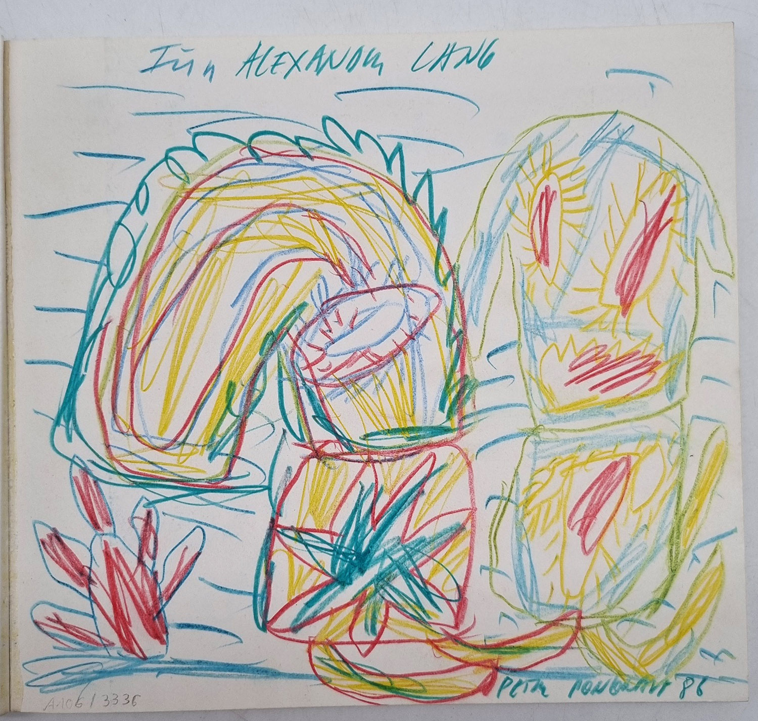 Original-Farbstiftzeichnung – Pongratz, Peter. Werke 1979-1987. Salzburg, 1988. Ca. 22 x 24 cm. 100 unpaginerte Seiten mit zahlreichen, teils farbigen Abbildungen. Farbig illustrierter Orig.-Karton. Vorsatzblatt mit einer ganzseitigen Original-Farbstiftzeichnung, signiert von Peter Pongratz, datiert 88. Der österr. Künstler (geb. 1940) beteiligte sich u.a. an der Intern. Biennale in Tokio, war 1968 eines der Gründungsmitglieder der Gruppe „Wirklichkeiten“ und entwarf Bühnenbilder für das Theater in der Josefstadt u.a. für Stücke von Elfriede Jelinek und Elias Canetti. Einband minimal angestaubt. Die Originalzeichnung in den Farben rot, gelb, blau und grün.
