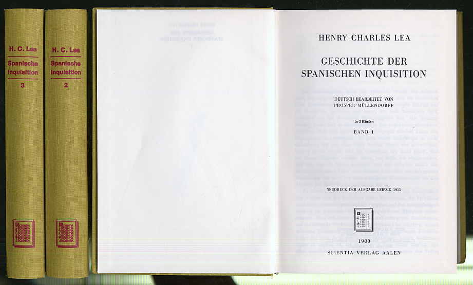 Inquisition – Lea, Henry Charles: Geschichte der spanischen Inquisition. Deutsch bearbeitet von Prosper Müllendorff. 3 Bände. Aalen, Scientia Vlg., 1980 (Neudruck der Ausgabe Leipzig 1911). Ca. 21,5 x 15 cm. XXVI S., 576 S.; VIII S., 499 S, (3) S.; VIII S., 448 Seiten. Orig.-Leinenbände. Ursprung und Begründung; Beziehung zum Staat; Gerichtsbarkeit und Gefüge der Inquisition; Einnahmen; Rechtspflege; Strafen; Das Feld der Inquisitionstätigkeit. Remittendenstempel auf Vorsatz, sonst sehr gutes Exemplar.