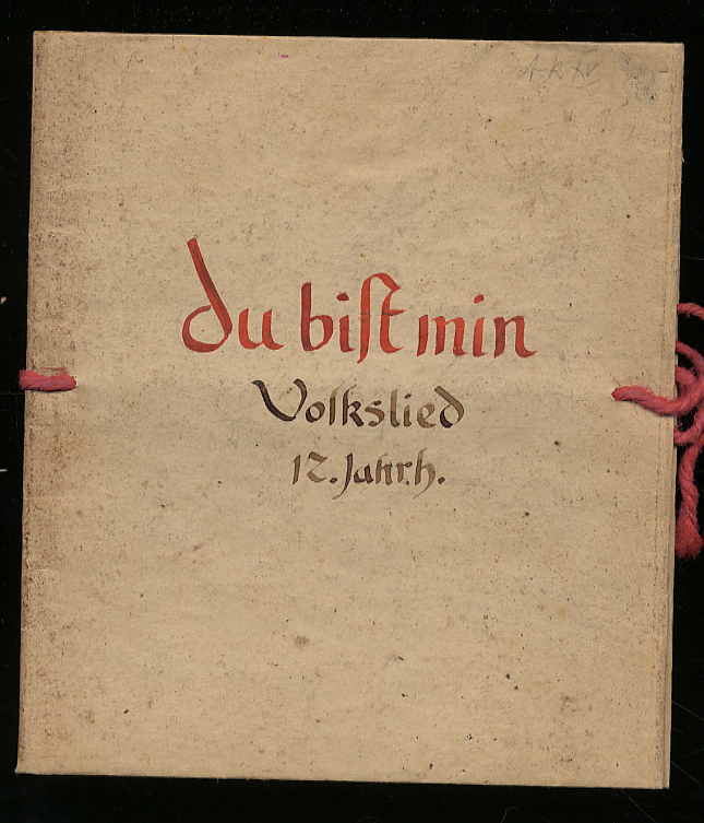 Handschrift – du bist min. Volkslied 12. Jahrh. O.J., um 1920. Ca. 18 x 15,5 cm. 1 einseitig beschriebenes Blatt, auf schwarzen Karton montiert. In Papierumschlag (mit Kordel) einmontiert. Handschrift [von Fritz Kuhlmann]. Kuhlmann stand der Arbeitsschulbewegung nahe und verfaßte mehrere Bücher zum Thema Schrift und Schreiben. Das (auf „alt“ eingefärbten) Blatt iin Original-Handschrift mit schwarzer und roter Tinte.