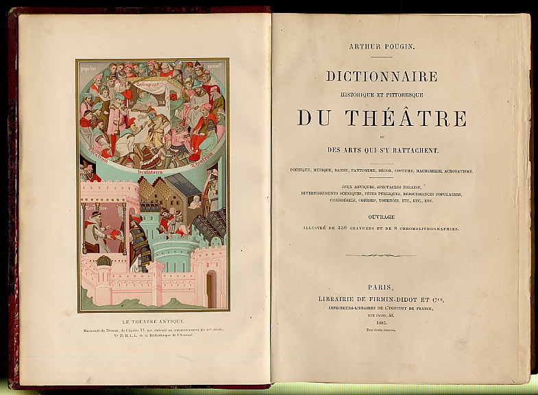 Pougin, Arthur: Dictionnaire historique et pittoresque du théatre et des arts qui s’y rattachent. Poétique, musique, danse, pantomime, décor, costume, machinerie, acrobatiqsme. Jeux antiques, spectacles forains, divertissements scéniques, fetes publiques, réjoussances populaires, carrousels, courses, tournois, etc.etc.etc. Paris, Librairie de Firmin-Didot, 1885. Ca. 27 x 19 cm. XV S., 775 Seiten. Mit 350 Textabbildungen und 8 chromolithographierten Tafeln. Halblederband der Zeit mit reicher Rückenvergoldung. Kopfgoldschnitt Umfangreiches Werk zur Theatergeschichte. Einband etwas berieben. Seiten teils leicht fingerfleckig. Hinteres Vorsatzblatt mit Notizen. In französischer Sprache.
