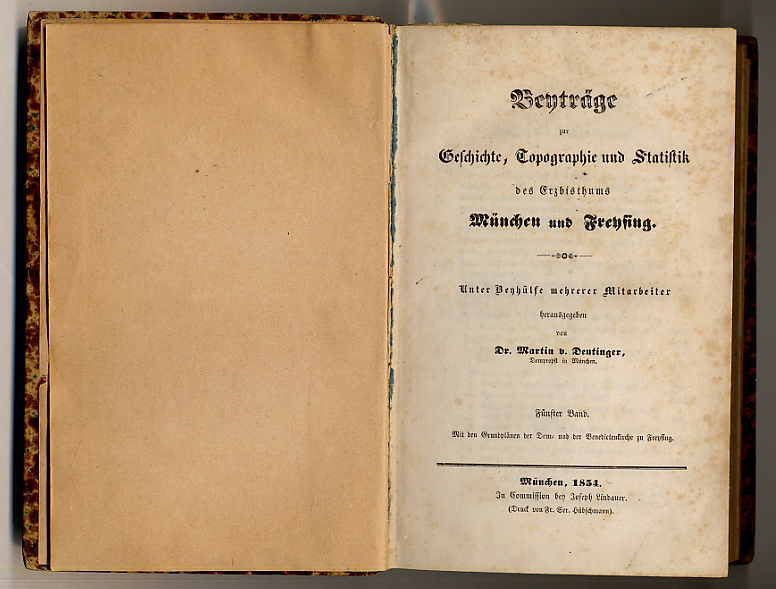 Deutinger, Martin v. (Hrsg.): 5. Band – Beyträge zur Geschichte, Topographie und Statistik des Erzbisthums München und Freysing. München, In Commission bey Joseph Lindauer, 1854. Ca. 21 x 14 cm. VI S., 568 S., (2) Seiten. Mit einem lithographierten Plan (Grundpläne der Dom- und der Benedictenkirche zu Freysing). Pappband der Zeit. Enthält u.a.: Jos. de Heckenstaller disseratio historica de antiquitate et aliis quibusdam memorabilibus cathedralis ecclesiae Frisingensis unacum serie Episcoporum, Praepositorum et Decanorum Frisingensium; Fredr. Wimmer’s Bibliographie des bayerischen Concordates von 1583; Zur Geschichte des Schulwesens in der Stadt Freysing (Seite 209 bis Schluss). Einband bestoßen und beschabt. Seiten teils etwas stockfleckig.