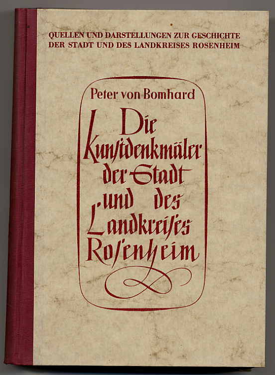Bomhard, Peter von: Die Kunstdenkmäler der Stadt und des Landkreises Rosenheim. 1. Teil: Die Kunstdenkmäler der Stadt und des Gerichtsbezirkes Rosenheim. Rosenheim, Verlag des Stadtarchivs Rosenheim, 1954. Ca. 24,5 x 17,5 cm. 464 Textseiten und Tafelteil. Mit 111 Abbildungen und 1 Karte. Orig.-Halbleinenband. Aus der Reihe: Quellen und Darstellungen zur Geschichte der Stadt und des Landkreises Rosenheim, hrsgg. von Albert Aschl, Band II/1. Stadt Rosenheim; Kirchliche Bauten; Abgegangene Kirchen; Profane Bauten; Fürstätt; Das Gebietlinks des Inn, nördlich von Rosenheim (z.B. Pfaffenhofen, Marienberg, Hochstätt, Schechen); Das Gebiet links des Inn, südlich von Rosenheim (z.B. Happing, Aising, Pang, Pfraundorf, Brannenburg, Wendelsteinkirchlein, Biber, Flintsbach, Petersberg, Kirnstein, Niederaudorf, Urfarn, Reisach, Wall, Oberaudorf, Kiefersfelden); Das Gebiet rechts des Inn, südlich von Rosenheim (z.B. Schloßberg, Kleinholzhausen, Riedering, Baierbach, Thansau); Das Gebiet rechts des Inn, nördlich von Rosenheim (z.B. Leonhardspfunzen, Zaisering, Prutting, Vogtareuth). Seiten gebräunt, Rücken unten minimal berieben, jedoch gutes Exemplar.