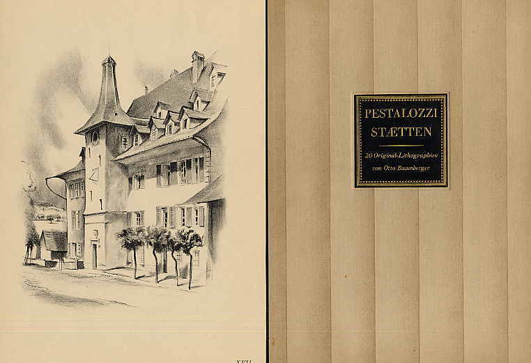 Baumberger – Pestalozzi-Staetten. Zwanzig Original-Lithographien von Otto Baumberger. Unter Mitwirkung des Pestalozzianums. Begleitwort von Hans Strettbacher. Zürich und Leipzig, Rotapfel-Verlag, ca. 1925. Ca. 32,5 x 23 cm. (8) Seiten Text, 20 Original-Lithographien auf Tafeln. Orig.-Halbleinenmappe. Gutes Exemplar.