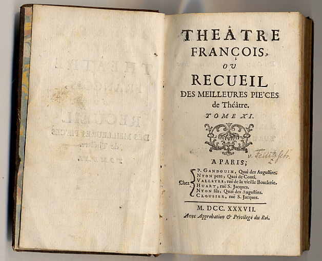 Theatre Francois ou recueil des meilleures pieces de Théatre. Tome XI. Paris, 1737. Ca. 16,5 x 9,5 cm. 616 Seiten. Ledereinband der Zeit mit Rückengoldprägung und Rückenschild. Enthält: Hypermnestre, Mahomet second, Caton D’Utique, Marius, Turcaret, Crispin Rival de son Maistre. Kanten und Kapital bestoßen. Namenszug auf Titelblatt. In französischer Sprache.