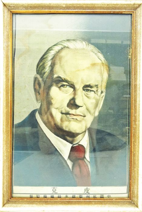 Seidenbild – Porträts – Pieck – Seidenbild – Friedrich Wilhelm Reinhold Pieck. Um 1950. Ca. 26,5 x 41 cm. Im Rahmen, hinter Glas. Gewebtes Seidenbild. Pieck (1876-1960, Politiker) war von 1949-1960 Präsident der DDR. Farbiges Porträt-Seidenbild mit gewebten chinesischen Schriftzeichen. Leicht stockfleckig und etwas gebräunt wasserrandig.
