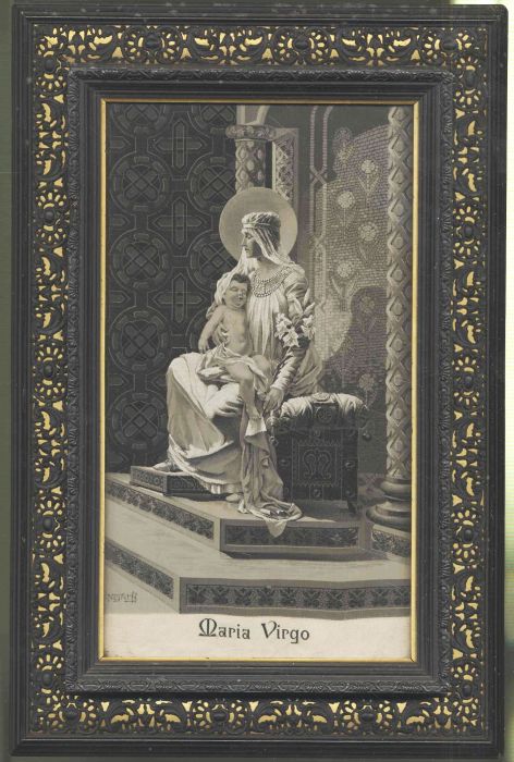 Seidenbild – Religion – Seidenbild – Maria mit dem Kinde (nach F. Lacaille). Maria Virgo. Ca. 26,5 x 15 cm. Gerahmt, hinter Glas. Sehr fein gewebtes Seidenbild, unten mit gewebtem Titel „Maria Virgo“. Im Gewebe signiert „Neyret ff“ (Neyret Freres, 1823 in St. Étienne gegründete französische Textilfabrik). Vgl. W. Walther: Bild im Band S. 52, mit Abbildung. Das Bild zeigt die sitzende Maria mit dem schlafenden Jesuskind, im Hintergrund Mosaikwände. Mit einem imposanten schwarzen Holzrahmen mit filigranem Relief auf goldfarbenem Hintergrund (Rahmen mit minimaler Beschädigung).