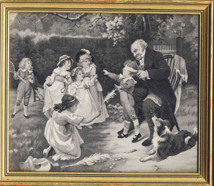 Seidenbild – Seidenbild – Colin-Maillard. – Blindekuh. Um 1910. Querformat, ca. 18,5 x 16 cm. Gerahmt, hinter Glas. Gewebtes Seidenbild nach einem Gemälde von Frederick Morgan (1847-1927). Ein Großvater spielt mit sechs Kinder Blindekuh, ein Hund schaut zu. Schriftenreihe Obere Mühle: „Ausstellung vom Seidenen Faden zum gewebten Kunstbild“, hier als „Blindekuh“ bezeichnet.