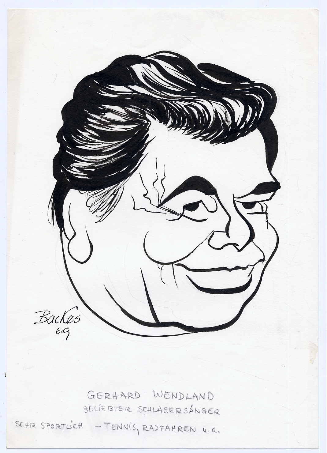Wendland, Gerhard (1916-1996, Schlagersänger) – Signierte Karikatur, Original-Porträtzeichnung von Lutz Backes. Beigefügt: Zettel mit eigenhändigen Glückszahlen, zwei Textzeilen, sowie Unterschrift von Gerhard Wendland. 1969 Ca. 29,5 x 21 cm. Der Karikaturist Lutz Backes (Künstlername „Bubec“) porträtierte für die Toto-Lotto-Zeitung Prominente, die ihre Lotto-Tipps abgaben. Hier das von Lutz Backes signierte Porträt von Gerhard Wendland. Beigefügt ein Zettel mit zwei handschriftlichenTextzeilen „So wird man Reich! Oder auch nicht. Liebe Grüsse“ von Gerhard Wendland mit sechs Glückszahlen, und eigenhändiger Unterschrift.