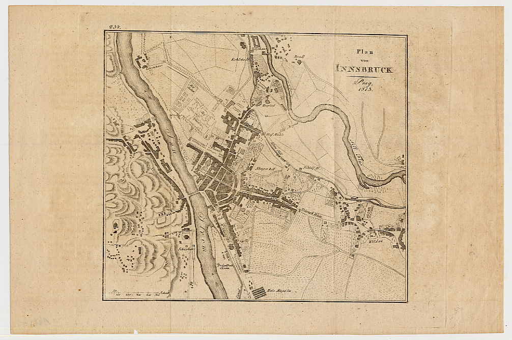 Innsbruck – Plan von Innsbruck. 1813. Ca. 17 x 19 cm. In Prag gedruckt. Vermutlich Nachstich des 1812 in dem Werk „Neueste Kunde von dem Königreiche Baiern“ im Industrie-Comptoir in Weimar erschienenen Plans. Zwei Faltknicke, sehr breitrandig.