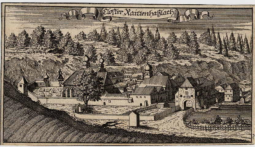 Raitenhaslach bei Burghausen – Closter Raittenhaßlach. 1690. Ca. 7,5 x 13,5 cm. Kupferstich aus dem „Churbayerischen Atlas“ von Ertl. Knapp bis zur Einfassungslinie beschnitten.