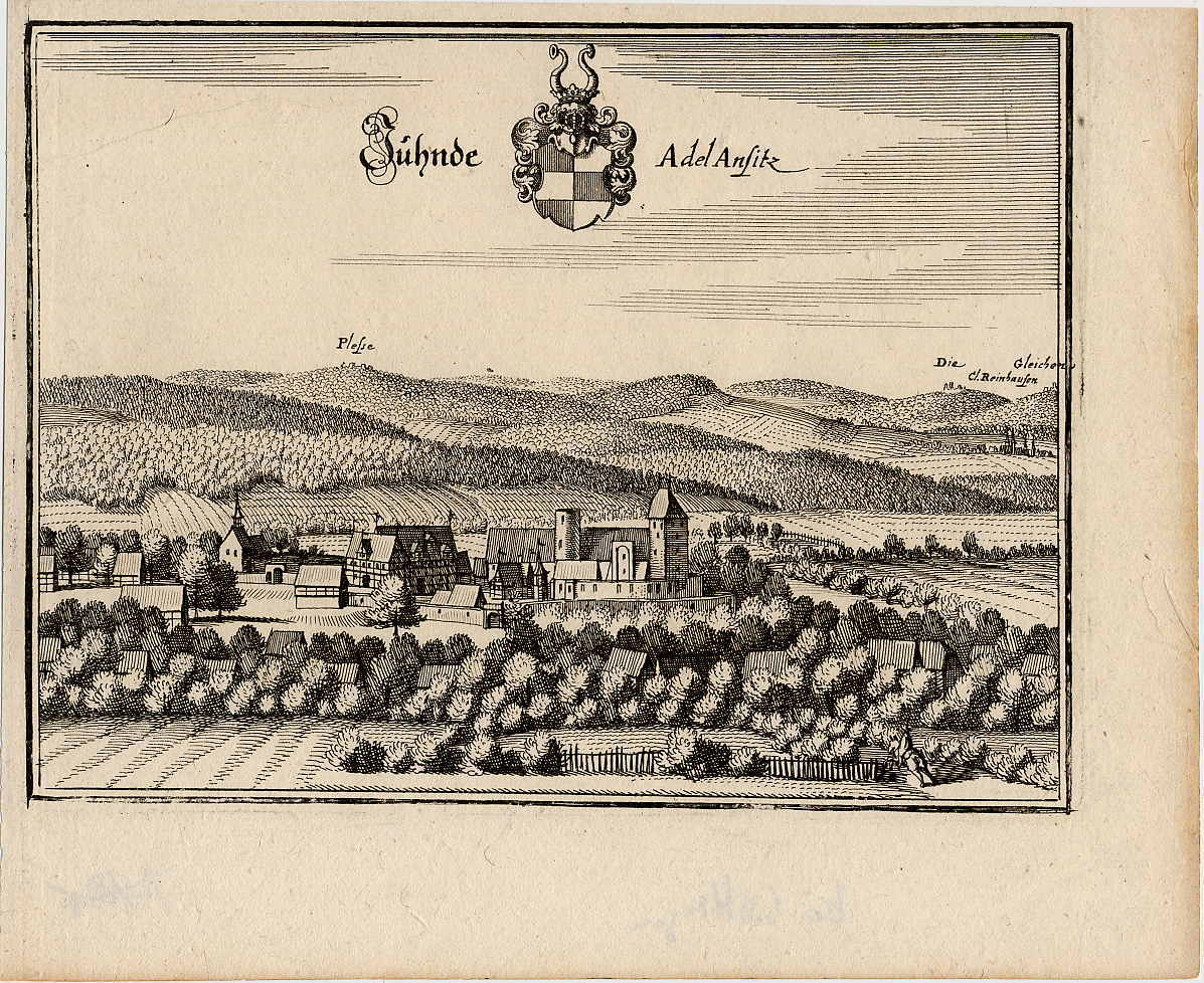 Jühnde – Göttingen – Jühnde. Adel-Ansitz. Ca. 13 x 17 cm. Kupferstich von Matthäus Merian aus der „Topographia Braunschweig“ (1654). Fauser 6268. Blattgr.: Ca. 16 x 20 cm.