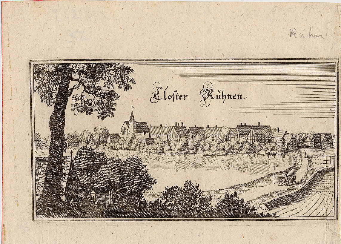 Rühn bei Bützow – Closter Rühnen. Ca. 9 x 17 cm. Kupferstich von Matthäus Merian aus der „Topographia Braunschweig“ (1654). Fauser 12167. Blattgr.: Ca. 14 x 19 cm.