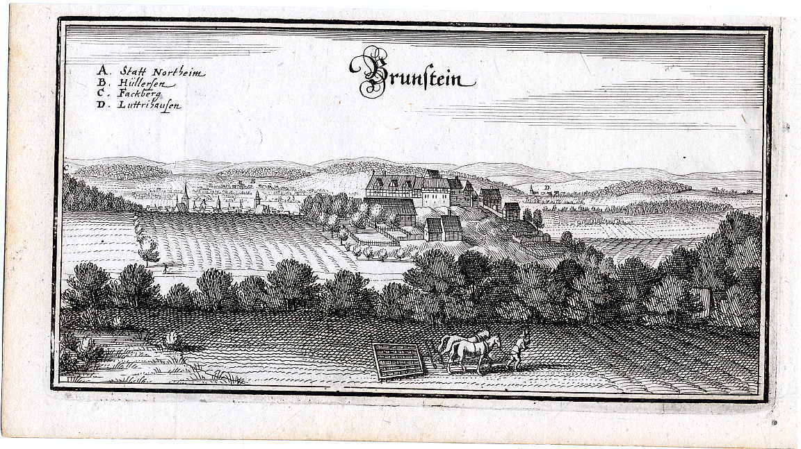 Langenholtensen – Brunstein. Ca. 9 x 17 cm. Kupferstich von Matthäus Merian aus der „Topographia Braunschweig“ (1654). Blattgr.: Ca. 10 x 20 cm.