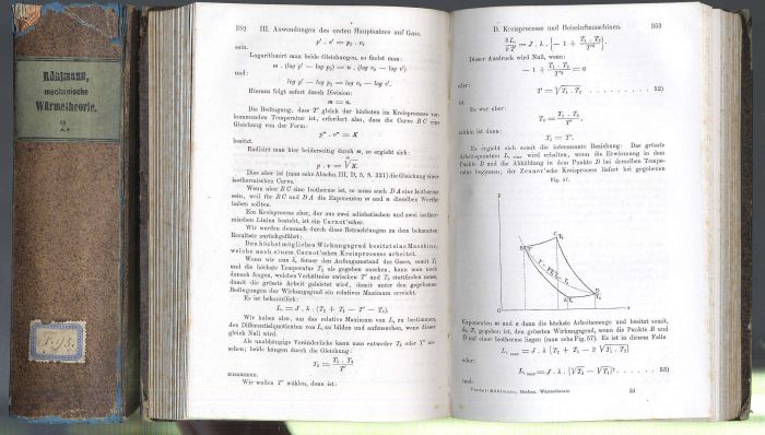 Rühlmann, Richard (Bearb.): Handbuch der mechanischen Wärmetheorie mit theilweiser Benutzung von É. Verdet’s Théorie mécanique de la chaleur. 2 Bände. Braunschweig, Friedrich Vieweg und Sohn, 1876. Ca. 21,5 x 14 cm. XXIII S., 800 Seiten, mit Textholzschnitten; XVIII S., (12) S., 1.001 Seiten, mit 68 Textholzschnitten. Pappbände der Zeit mit geprägten Rückenschildern. Einbandkanten und Rücken bestoßen und mit kleinen Fehlstellen im Überzugspapier. Rücken mit Bibliotheksaufkleber. Vorsatz und Titelblatt mit Stempeln einer aufgelösten Bibliothek. Seiten teils stockfleckig, einige Seiten auch stärker.