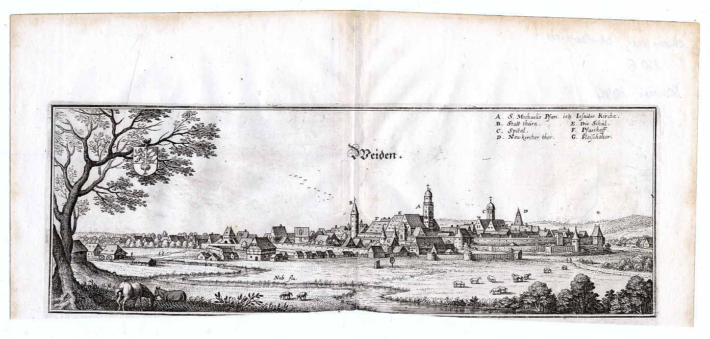 Weiden- Merian – Gesamtansicht von Weiden in der Oberpfalz. Kupferstich von Matthäus Merian. Um 1644. Ca. 11,5 x 33,5 cm. In der Mitte am unteren Rand ca. 2 mm in den Bildrand beschnitten. Dekorative Gesamtansicht.