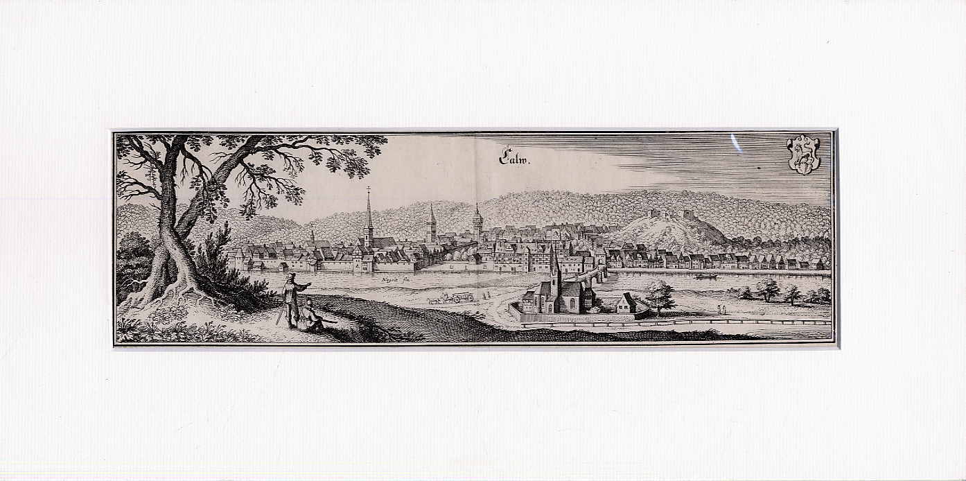 Calw Merian – Gesamtansicht von Calw. Kupferstich von Matthäus Merian. Um 1644. Ca. 10 x 32 cm. Unter Passepartout. Dekorative Gesamtansicht Stadt Calw in Baden-Württemberg.