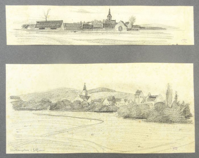 Kuttenplan – Original-Kohlestift-Zeichnung – Zwei monogrammierte Kohlestift-Zeichnungen. Zusammen montiert auf dunklem Karton, dieser mit Atelierstempel von Carl Throll. Die Zeichnungen im Format ca. 6 x 30 und 14,5 x 29 cm. Kuttenplan – Chodová Planá, südlich von Marienbad in Tschechien/Böhmen gelegen. Karl Throll, geb. 1873, war Maler und Restaurator. Er studierte an der Kunstgewerbe-Schule und Akademie in München.