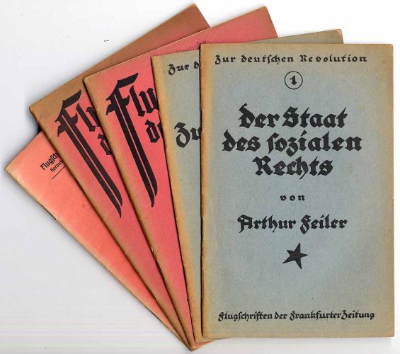 Flugschriften 1919 – Konvolut von fünf Flugschriften: 1) Athur Feiler: Der Staat des sozialen Rechts. 27 Seiten; 2) Walter Kamper: Zum Neuaufbau des Reiches. 20 Seiten; 3) Hugo Heinemann: Die Reform des deutschen Strafrechts. 36 Seiten; 4) Paul Umbreit: Der Wiederaufbau unserer Volkswirtschaft. 31 Seiten; 5) Heinrich Pesch: Sozialisierung. Original-Broschuren. Aus den Reihen: Flugschriften der „Stimmen der Zeit“; „Flugschriften der Revolution“ und „Zur deutschen Revolution. Sonderabdruck aus der Frankfurter Zeitung“. Eine Broschur Rücken aufgeplatzt. Papier durchgehend gebräunt.