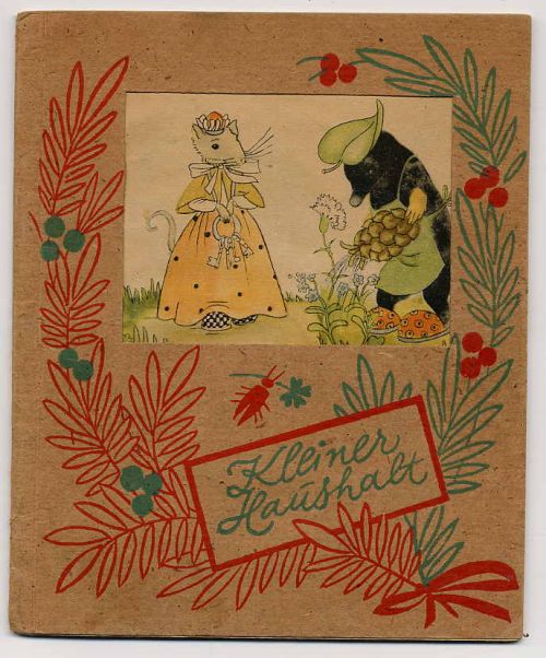 Rückert, Friedrich: Kleiner Haushalt. Eine lyrische Phantasie. Berlin, Chronos Verlag, [1947]. Ca. 17 x 13,5 cm. (26) Seiten. Mit 13 farbigen Illustrationen von Hilde Kiessling. Originalkartonierter Einband. Der Vorderckel mit ausgeschnittenem Fenster, darunterliegend die Titelillustration. Mit reizvollen Illustrationen. Einband etwas gebräunt. Ein Blatt doppelt eingebunden.