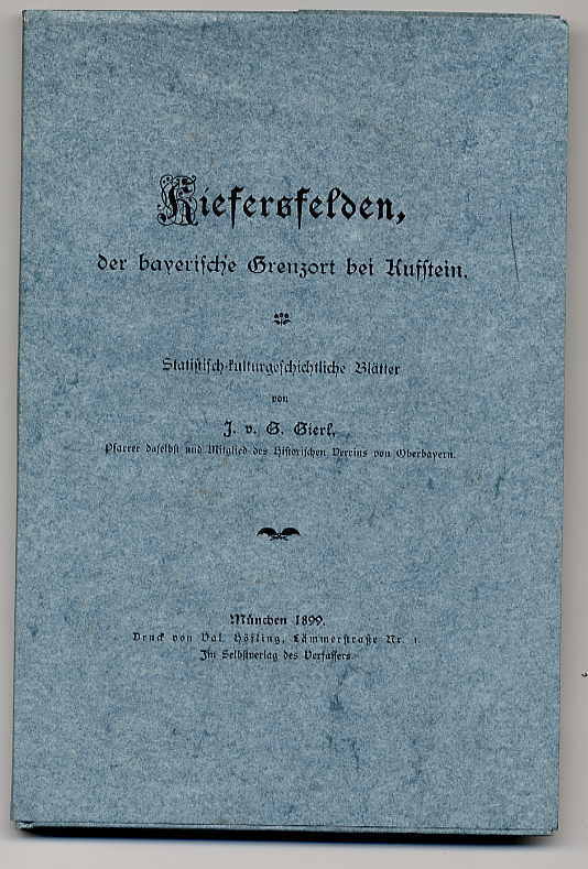 Gierl, J.v.G.: Kiefersfelden, der bayerische Grenzort bei Kuffstein. Statistisch-kulturgeschichtliche Blätter. Nachdruck der Ausgabe München 1899, Kiefersfelden, Kurz, [1989]. 8°. 3 Bl., 115 S. Orig.-Pappband mit Schutzumschlag. Schutzumschlag am Rücken kleiner Einriss, sonst tadelloses Exemplar.