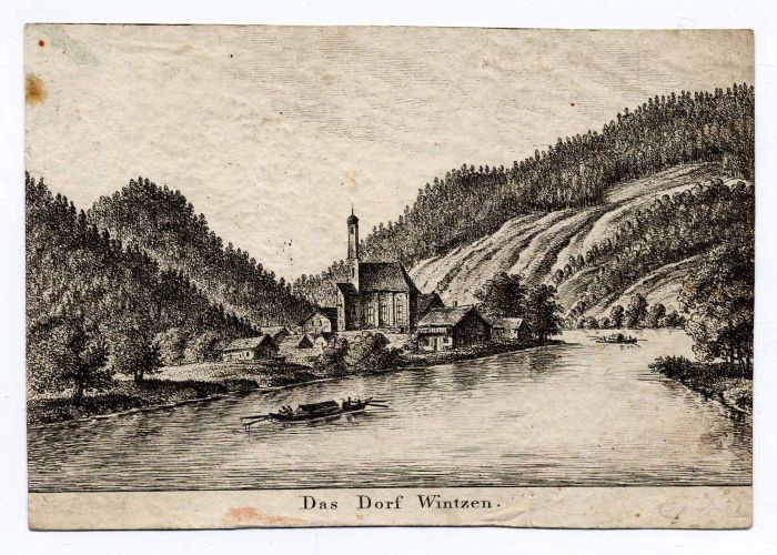 Winzen/Donau – Das Dorf Wintzen. Kupferstich. Um 1818. Ca. 10 x 14 cm. Kupferstich auf etwas festerem Papier. Am unten unbedruckten Rand leicht fleckig, kleiner bräunlicher Felck am linken oberen Rand.