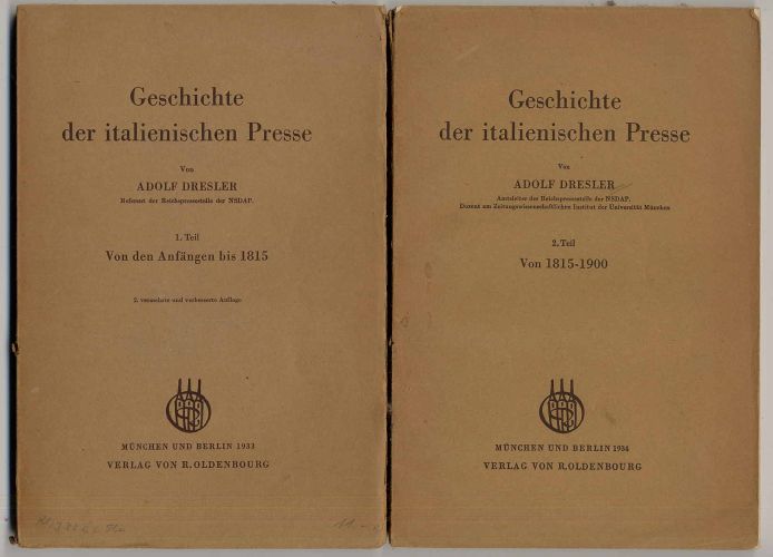 Dresler, Adolf: Geschichte der italienischen Presse. 1. Teil: Von den Anfängen bis 1815 (2. vermehrte und verbesserte Auflage); 2. Teil: Von 1815-1900. 2 Bände. München und Berlin, R. Oldenbourg, 1933-1934. Ca. 35 x 17,5 cm. X S., (2) S., 171 Seiten; X S., (2) S., 178 S., (2) Seiten. Orig.-Broschuren. Es erschien noch ein 3. Teil von 1900-1935, dieser liegt hier nicht vor. Teils etwas stockfleckig, teils unaufgeschnitten.