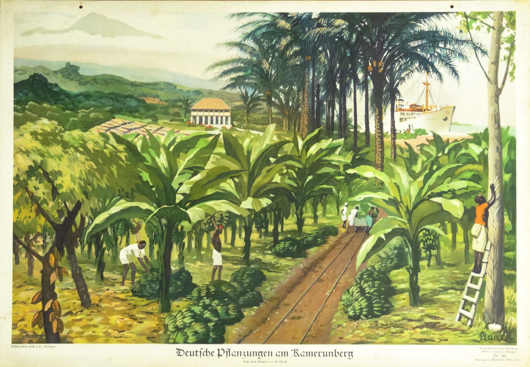 Schulwandbild – Lehrtafel – Kamerun – Deutsche Pflanzungen am Kamerunberg. Stuttgart, Verlag Der Praktische Schulmann, Keller & Nehmann, 1941. Querformat, ca. 63,5 x 91,5 cm. Farboffset nach einem Original von Willy Planck. Bild Nr. 283, zeigt eine Bananenplantage in Kamerun. Eva Zimmer: Wandbilder für die Schulpraxis, S. 256; S. 98 ff: „In warmen Farben werden … sonnige Landschaften inszeniert, die den Schülerinnen und Schülern einen Einblick in … ehemalige afrikanische Kolonien der Deutschen liefern. … Betont werden aber vor allem – dem Impetus des nationalsozialistischen Vierjahresplans folgend – unterschiedliche Rohstoffe, welche die Kolonien für die Deutschen so attraktiv machen. … werden tropische Früchte bzw. eine Bananenplantage dargestellt. Im Hintergrund der Bananenplantage versinnbildlicht zudem ein großes Schiff die Verbindung zum europäischen Kontinent, wohin die Rohstoffe transportiert werden.“ „Auch die Kolonialtätigkeit des Deutschen Reiches wird in Farbprospekten verharmlost, die eine kultiviert exotische Landschaft mit geschäftigen oder glücklich lächelnden Ureinwohnern vorstellen.“ (Die weite Welt im Klassenzimmer, S. 58). Am oberen Rand mit kleinen Ösen zum Aufhängen. Handschriftl. Inventarnummer am unteren weißen Rand. Rand etwas fleckig.