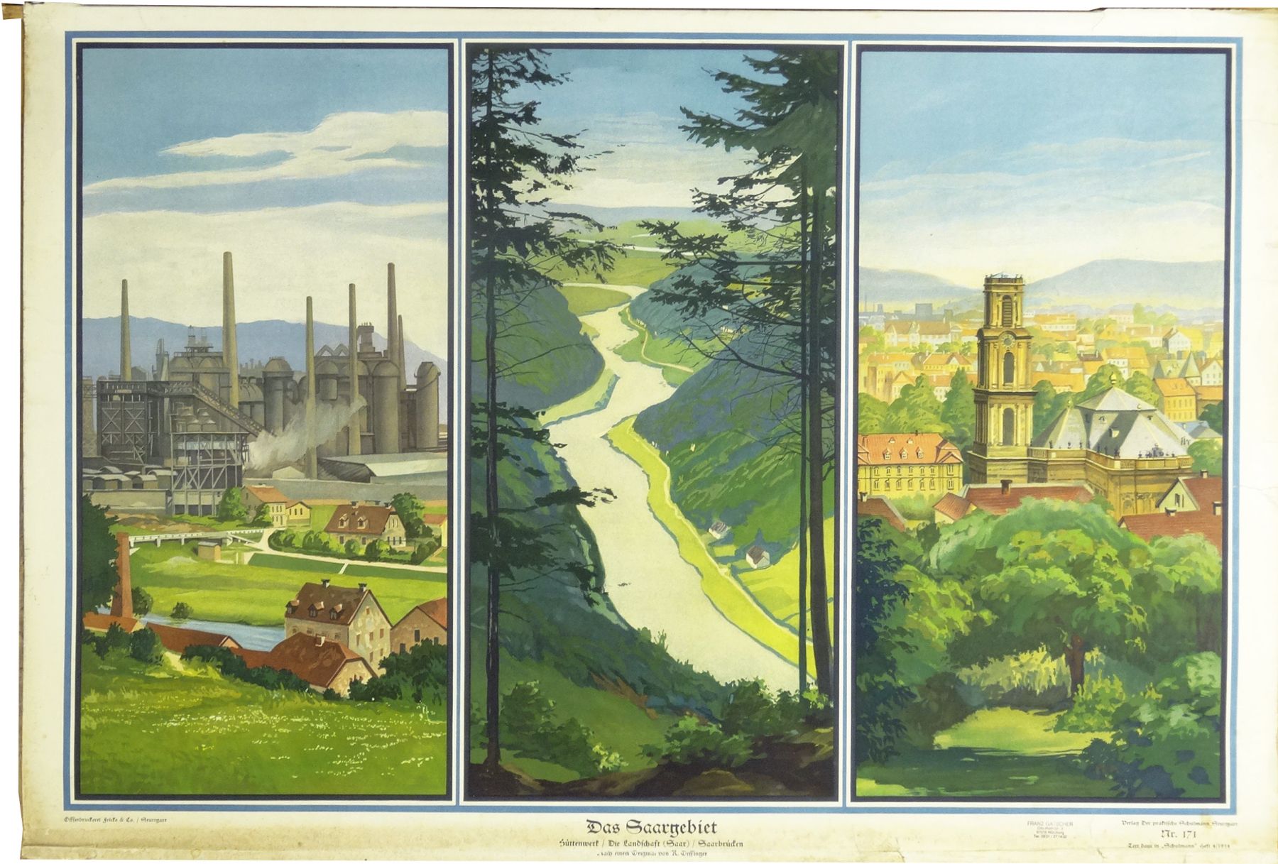 Schulwandbild – Lehrtafel – Saarland – Das Saargebiet. Hüttenwerk – Die Landschaft (Saar) – Saarbrücken. Stuttgart, Verlag Der Praktische Schulmann, 1934. Querformat, ca. 62,5 x 93,5 cm. Farboffset nach einem Original von Rudolf Oeffinger. Bild Nr. 171. Oberer und unterer Rand mit Holzleiste verstärkt. Ränder etwas fleckig und mit kleinen Einrissen. Eva Zimmer: Wandbilder für die Schulpraxis, S. 248. „Während andere Schulwandbildproduzenten sich meist auf wenige Fachbereiche spezialisierten, deckt der ‚Schulmann‘ mit seinen Bildern … ein weitaus breiteres thematisches Spektrum ab. … (die) Verlagsarbeit des ‚Schulmanns‘ (ist) von der politisch wie kulturell besonders wechselhaften Geschichte des 20. Jahrhunderts geprägt.“ (Zimmer: Wandbilder … S. 13/14). Karte in drei Bilder geteilt: Ansicht eines Hüttenwerkes, die Saar, Ansicht von Saarbrücken.