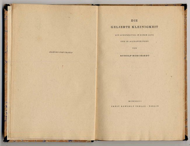 Borchardt, Rudolf: Die geliebte Kleinigkeit. Ein Schäferspiel in einem Akte und in Alexandrinern. Berlin, Ernst Rowohlt Verlag, 1923. Ca. 22,5 x 15 cm. 62 S., (2) Seiten. Halblederband mit goldgeprägtem Rückentitel. Erste Ausgabe. WG 28. „Sein gesamtes Werk ist durch eine überragende Sprachbegabung gekennzeichnet. Dem Dichter ging es vornehmlich um die Beherrschung der Form.“ (A. Elschenbroich in NDB 2 S. 456-457). Einbandkanten und Rücken berieben.