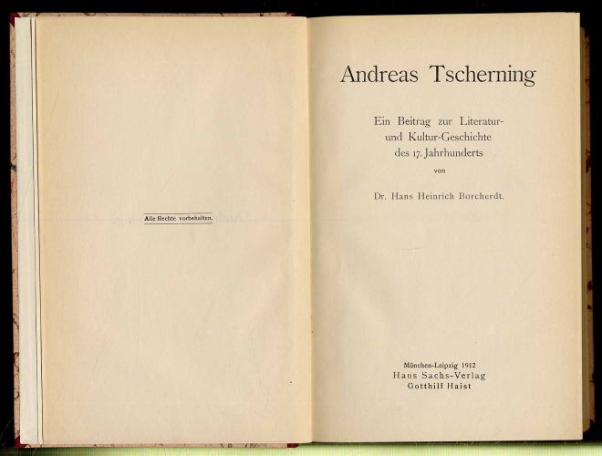 Tscherning – Hans Heinrich Borcherdt: Andreas Tscherning. Ein Beitrag zur Literatur- und Kultur-Geschichte des 17. Jahrhunderts. München-Leipzig, Hans Sachs-Verlag Gotthilf Haist, 1912. Ca. 22,5 x 15,5 cm. (10) S., 375 S., (1) Seite. Moderner Halbleinenband. Inhalt u.a.: Die Familie Tscherning in Bunzlau; Der Schüler Martin Opitzens; Dichtungen der Rostocker Studentenzeit; Die Sprüche des Ali; Tschernning als Dramatiker; Der Rostocker Professor; Tschernings Metrik; Krankheit und Tod; Verzeichnis der erhaltenen