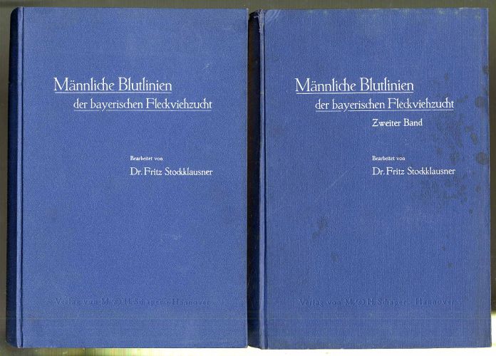 Stockklausner, Fritz: Die bedeutendsten männlichen Blutlinien der bayerischen Fleckviehzucht. Hrsgg. von der Arbeitsgemeinschaft bayerischer Fleckviehzuchtverbände. 2 Bände. Hannover, M. & H. Schaper, 1933-1936. Ca. 26 x 18 cm. XVI S., 356 Seiten, mit 22 Abbildungen auf 11 Kunstdrucktafeln; XV S., 550 Seiten, mit 28 Abbildungen auf 14 Kunstdrucktafeln. Blaue Orig.-Leinenbände. Rücken von Band zwei bestoßen, Einband hier etwas fleckig. Schnitt etwas stockfleckig, jedoch gutes Exemplar. „Die Beschreibung jedes Bullen bringt Name, Herdenbuchnummer mit Verbandszeichen und Geburtsdatum des Bullen. … Dann folgt Name und Wohnort des Besitzers mit Angabe des Jahres, bis zu welchem der Bulle in Zuchverwendung stand. Ferne Angabe eventueller Inzuchtgrade, dann Name und Nummer des Vaters, dann Name und Nummer der Mutter, der Großeltern und Urgroßeltern in der weiblichen Linie, soweit sie bekannt sind. … Körpermaße … von erwachsenen Bullen … errungene Erfolge und die Angabe der Zahl der eingetragenen Söhne und Töchter.“ (Einleitung).