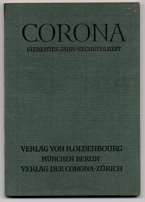 Bodmer, Martin und Herbert Steiner (Hrsg.): Corona. Siebentes Jahr, sechstes Heft. München – Berlin, R. Oldenbourg, 1937. Ca. 21 x 15 cm. Grüner originalkartonierter Einband. Corona, literarischen Zweimonatsschrift, die in den Jahren 1930 bis 1943 in München und Zürich erschien. Mit Beiträgen u.a. von Hermann Hesse, Herzog von Northumberland, Wjatscheslaw Iwanow, Werner Zemp, Rudolf Borchardt.