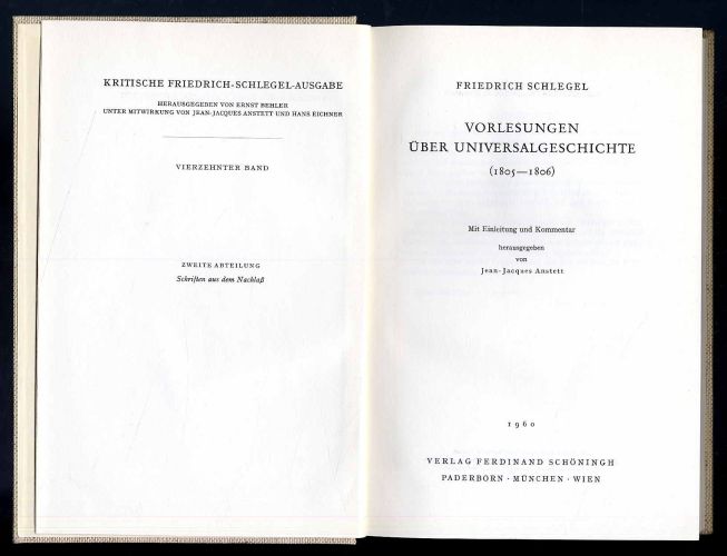 Schlegel, Friedrich: Vorlesungen über Universalgeschichte (1805-1806). Mit Einleitung und Kommentar hrsgg. von Jean-jacques Anstett. Sonderausgabe für die Wissenschaftliche Buchgesellschaft Darmstadt. Paderborn u.a., Ferdinand Schöningh u.a., 1960. Ca. 23,5 x 15,5 cm. LXXXI S., 277 Seiten. Orig.-Leinenband. Aus der Reihe: Kritische Friedrich-Schlegel-Ausgabe, hrsgg. von Ernst Behler, 14. Band, 2. Abteilung: Schriften aus dem Nachlaß. Gutes Exemplar.