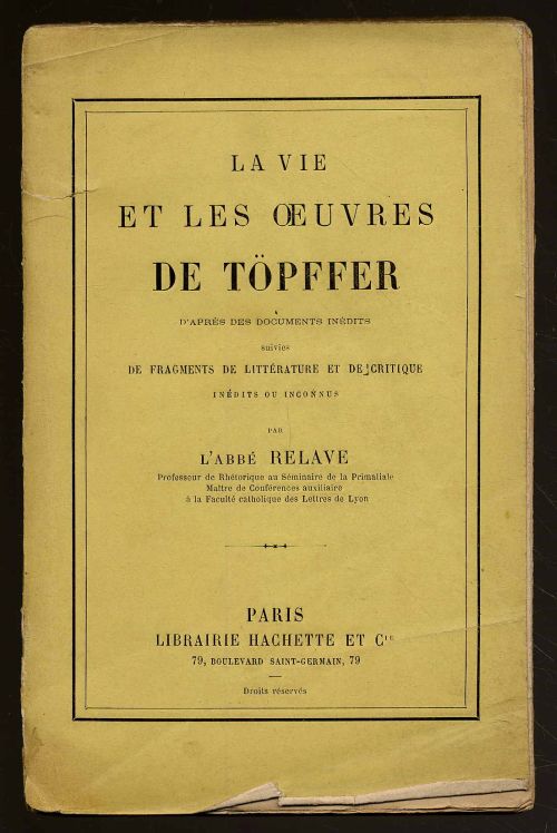 Relave, [Pierre-Maxime]: La vie et les oeuvres de Töpffer d’après des documentes inédits suivies de fragments de littérature et de critique inédits ou inconees. Paris, Librairie Hachette et Cie., 1886. Ca. 19 x 12 cm. (6) S., 383 Seiten. Orig.-Broschur. Einband etwas angerändert und bestoßen, Rücken mit kleiner Fehlstelle im Überzugspapier. Unbeschnittenes Exemplar. In französischer Sprache.
