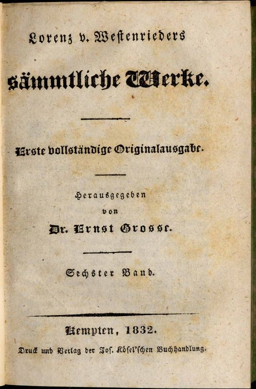 Westenrieder, Lorenz v.: Sämmtliche Werke. 6. Band. Erste vollständige Originalausgabe. Hrsgg. von Ernst Grosse. Kempten, Jos. Kösel’sche Buchhandlung, 1832. Ca. 13,5 x 9,5 cm. 419 Seiten. Halbleinenband der Zeit mit Rückenblind- und Rückengoldprägung. Einband etwas berieben. Vorsatz mit Stempel. Teils etwas stockfleckig, jedoch gutes Exemplar. Hier Band 6 (Leben des guten Jünglings Engelhof, 3. (letzter) Teil; Schriften über das Theater) der gesammelten Werke des Theologen, Pädagogen, Historikers und Publizisten der Aufklärung Lorenz Westenrieder (1748-1829), der als Wiederentdecker der bayerischen Vorgeschichte und wohl bedeutendster literarischer Aufklärer des katholischen Deutschland gilt.