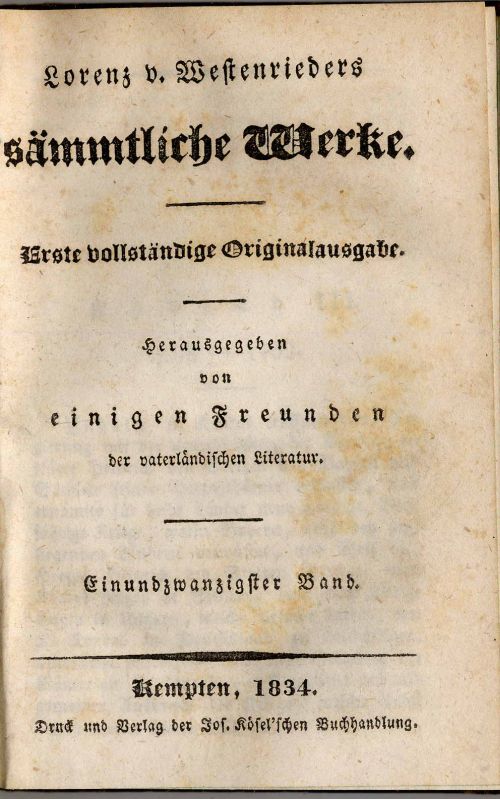 Westenrieder, Lorenz v.: Sämmtliche Werke. 21. Band. Erste vollständige Originalausgabe. Hrsgg. von einigen Freunden der vaterländischen Literatur. Kempten, Jos. Kösel’sche Buchhandlung, 1834. Ca. 13,5 x 9,5 cm. (2) S., 325 Seiten. Halbleinenband der Zeit mit Rückenblind- und Rückengoldprägung. Einband etwas berieben. Vorsatz mit Stempel. Teils etwas stockfleckig, jedoch gutes Exemplar. Hier Band 21 (Konrad III., Friedrich I., Kaiser Philipp, Friedrich II., Konrad IV) der gesammelten Werke des Theologen, Pädagogen, Historikers und Publizisten der Aufklärung Lorenz Westenrieder (1748-1829), der als Wiederentdecker der bayerischen Vorgeschichte und wohl bedeutendster literarischer Aufklärer des katholischen Deutschland gilt.