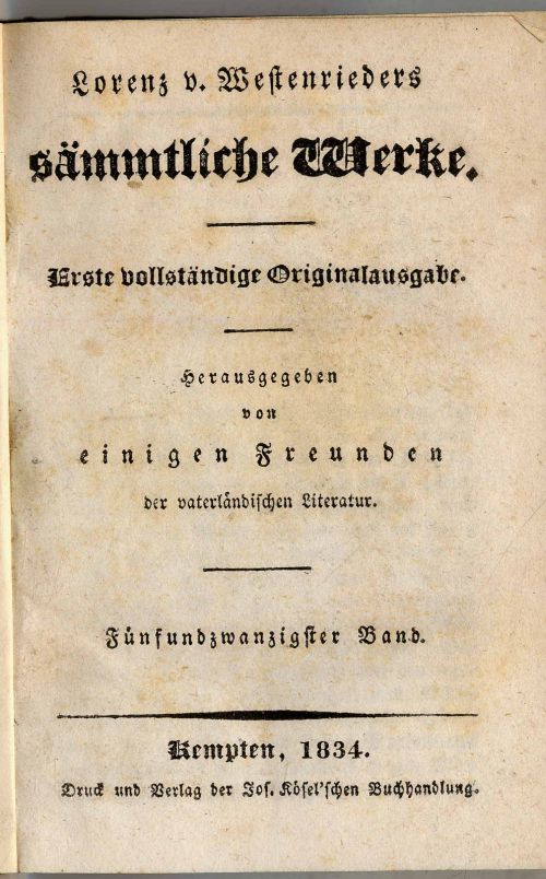 Westenrieder, Lorenz v.: Sämmtliche Werke. 25. Band. Erste vollständige Originalausgabe. Hrsgg. von einigen Freunden der vaterländischen Literatur. Kempten, Jos. Kösel’sche Buchhandlung, 1834. Ca. 13,5 x 9,5 cm. 398 Seiten. Halbleinenband der Zeit mit Rückenblind- und Rückengoldprägung. Einband etwas berieben. Vorsatz mit Stempel. Teils etwas stockfleckig. Hier Band 25 (Maximilian I. 1493-1519; Beschaffenheit des deutschen (bürgerlichen, sittlichen und litterarischen) Wohlstandes, zur Zeit, da Karl V. als deutscher Kaiser auftrat; Karl V. 1519-1558) der gesammelten Werke des Theologen, Pädagogen, Historikers und Publizisten der Aufklärung Lorenz Westenrieder (1748-1829), der als Wiederentdecker der bayerischen Vorgeschichte und wohl bedeutendster literarischer Aufklärer des katholischen Deutschland gilt.