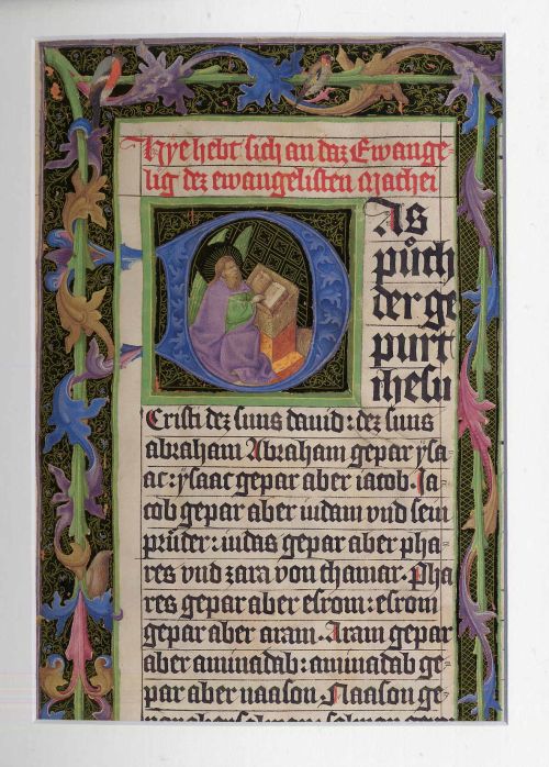 Wolf, Norbert: Meister deutscher Buchmalerei zwischen Spätgotik und Reformation. Herausgegeben von Ingo F. Walther. Luzern, Faksimile Verlag Edition Bel-Libro, 2005. Ca. 32 x 23,5 cm. 125 S., (3) Seiten. Mit zahlreichen farbigen Illustrationen und einem beigegebenen Faksimile aus der Otheinrich-Bibel, Folio 10. Blauer Orig.-Leinenband mit Goldprägung. Aus der Reihe: Die Galerie der schönsten Bücher, Buchmalerei erleben. Das Faksimile unter starkem Passepartout, dem Titelblatt vorgebunden. Sehr gutes Exemplar.