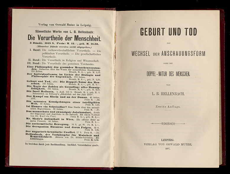 Hellenbach, L. B.: Geburt und Tod als Wechsel der Anschauungsform oder: die Doppel-Natur des Menschen. 2. Auflage Leipzig, Oswald Mutze, 1897. Ca. 21 x 14 cm. VIII, 325 XI Seiten (Anzeigen). Halblederband der Zeit. Etwas berieben, oberes Kapital seitlich mit kleinem Einriss, Buchblock beim Titel angebrochen. Text sauber.