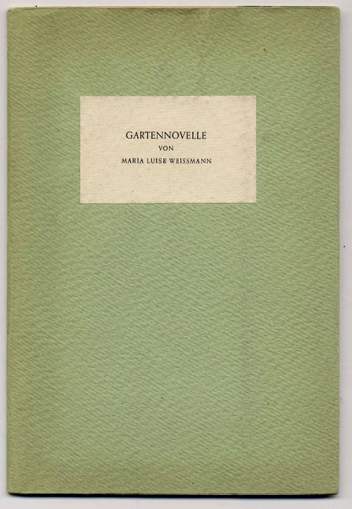 Weissmann, Maria Luise: Gartennovelle. Söcking, Heinrich F.S. Bachmair, 1949. Ca. 23 x 15,5 cm. 35 S., (3) Seiten. Grüner Originalkartonierter Einband. Einband etwas angestaubt bzw. lichtrandig. Maria Luise Weissmann (1899 Schweinfurt -1929 München), Auflage 1500 Stück.