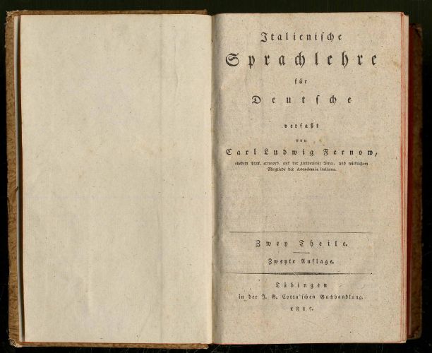 Fernow, Carl Ludwig: Italienische Sprachlehre für Deutsche. 2. Auflage. Zwey Theile in einem Band. Tübingen, J. G. Cotta’sche Buchhandlung, 1815. Ca. 20 x 12,5 cm. XXII S., 464 Seiten; fortlaufend bis Seite 874. Pappband der Zeit mit handgeschriebenem Rückenschild. Einband berieben und Kanten bestoßen. Fernow (1763-1808), Apotheker, studierte ab 1791 in Jena kantische Philosophie, siedelte 1794 nach Rom über und wurde 1802 auf Wunsch Goethes außerordentlicher Professor der Ästhetik in Jena, 1804 Bibliothekar der Herzogin