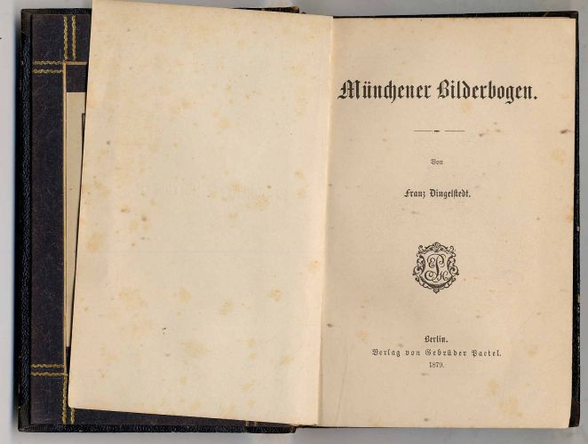 Dingelstedt, Franz: Münchener Bilderbogen. Berlin, Gebrüder Paetel, 1879. Ca. 18 x 12,5 cm. (6) S., 199 Seiten. Halblederband der Zeit mit goldgeprägtem Rückentitel. Erste Ausgabe. Einbandkanten etwas bestoßen. Exlibris mit ausradiertem Namen auf Vorsatz tiefergelegt einmontiert. Seiten und Schnitt teils leicht stockfleckig. Süffisanter Bericht über seine Zeit als Hoftheaterintendant in München von 1851 bis 1857. Das Münchner Publikum stand dem ehemals provozierenden kurhessischen Lyriker zunächst feindselig und ablehnend gegenüber.