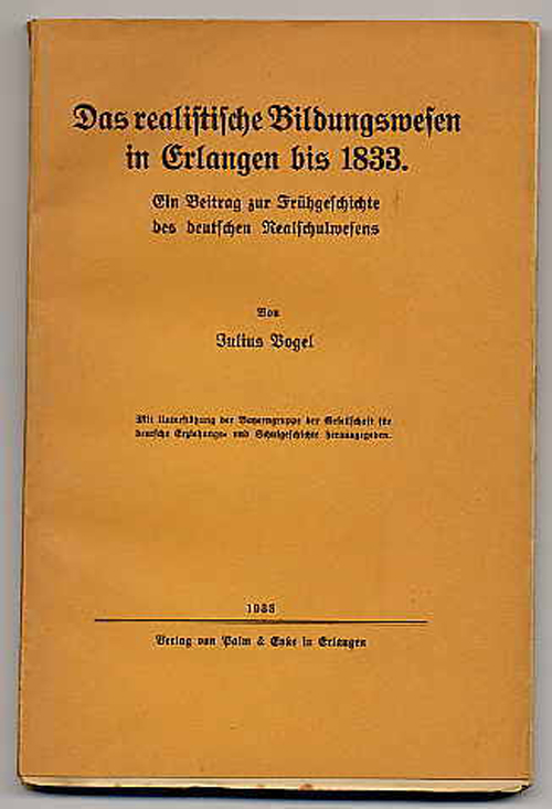 Vogel, Julius: Das realistische Bildungswesen in Erlangen bis 1833. Ein Beitrag zur Frühgeschichte des deutschen Realschulwesens. Erlangen, Verlag von Palm & Enke, 1933. Ca. 25 x 16,5 cm. (8) S., 170 (S), (2) Seiten. Originalkartonierter Einband. Mit Unterstützung der Bayerngruppe der Gesellschaft für deutsche Erziehungs- und Schulgeschichte herausgegeben. Einband etwas lichtrandig mit kleinen Einrissen. Schnitt etwas stockfleckig. Mit handschriftlicher Notiz auf Titelblatt.