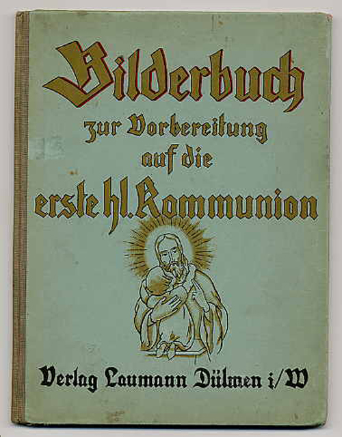 Kreuser, M[artin]: Bilderbuch zur Vorbereitung auf die erste heilige Kommunion. Bilder von Paula Maria Crassé. Dülmen in Westfalen, Verlag Laumann, 1934. Ca. 25 x 19 cm. 23 S., (1) Seite, mit zahlreichen farbigen Illustrationen. Orig.-Halbleinenband. Einband etwas fleckig. Mit handschriftlicher Notiz und kleinem Besitzstempel auf Vortitel. Buchdeckel leicht gelockert.
