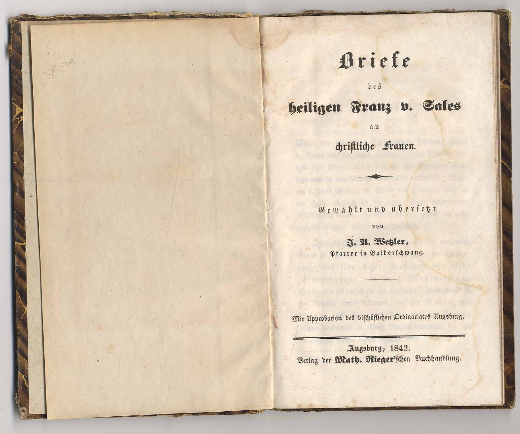 Wetzler, J.A.: Briefe des heiligen Franz v. Sales an christliche Frauen. Gewählt und übersetzt. Augsburg, Math. Rieger’sche Buchhandlung, 1842. Ca. 18 x 11 cm. 108 Seiten. Pappband der Zeit. Einband stärker berieben. Seiten teils fleckig.