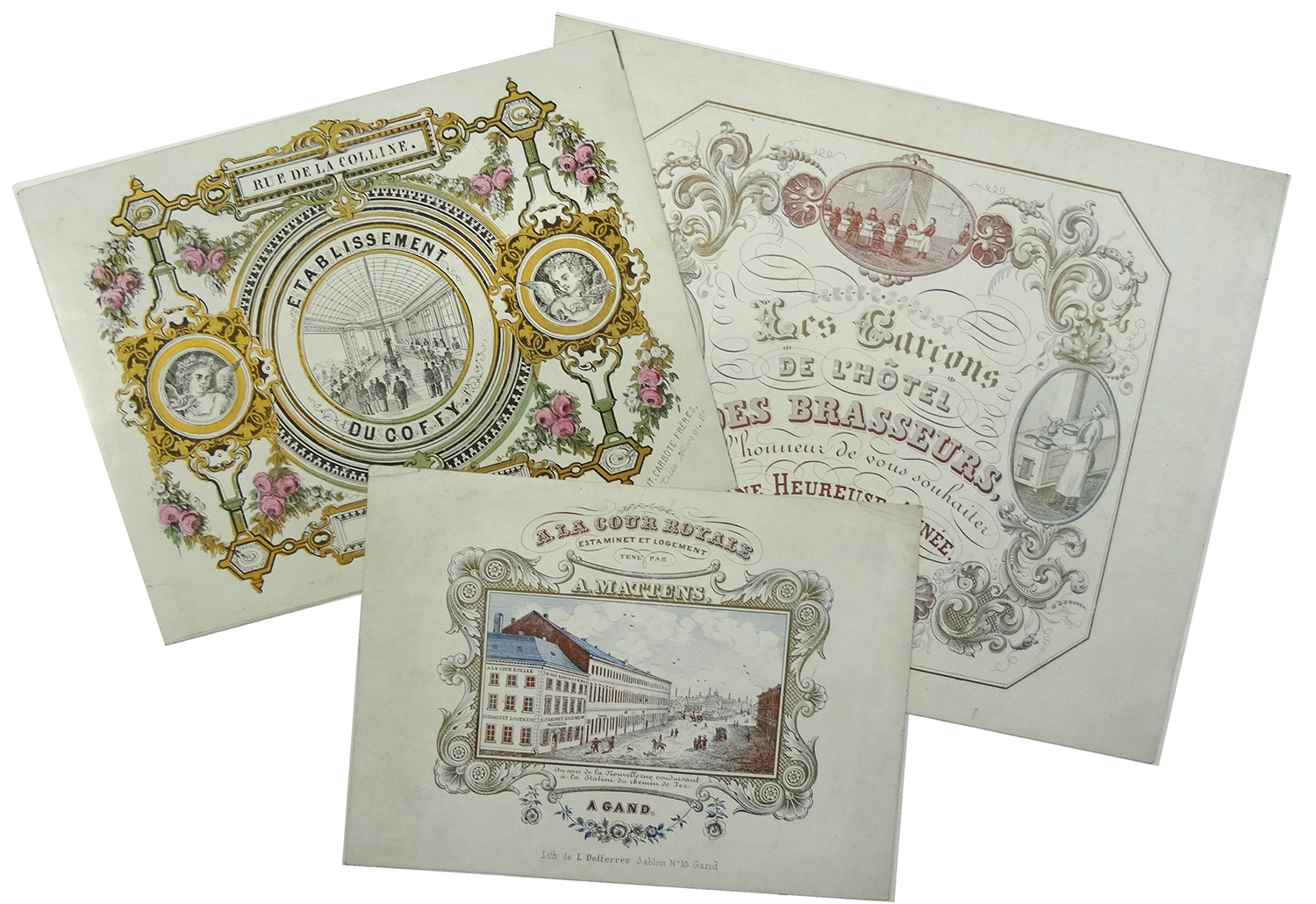 Werbung – Belgien – 3 Werbekarten: Bruxelles, Rue de la Colline Etablissement du Coffy; (Brüssel): Les garcons de l’Hotel des Brasseurs out l’honneur de vous souhaiter une heureuse année; Gent: a la cour royale esta minet et logement tenu par A. Mattens. Ca. 1865. Verschiedene Formate: Ca. 12,5 x 17,5 cm bis ca. 19 x 23,5 cm. Farbig lithographierte Werbekarten eines Kaffeehauses in Brüssel, eines Hotels in Gent und eine Neujahrsglückwunschkarte eines Hotels und Restaurants in Brüssel. Die Kaffeehauskarte rückseits mit Kalender, datiert 1864. Mit leichten Randknicken. Die Rückseiten mit größeren Resten von Aufklebern. Dekorativ!