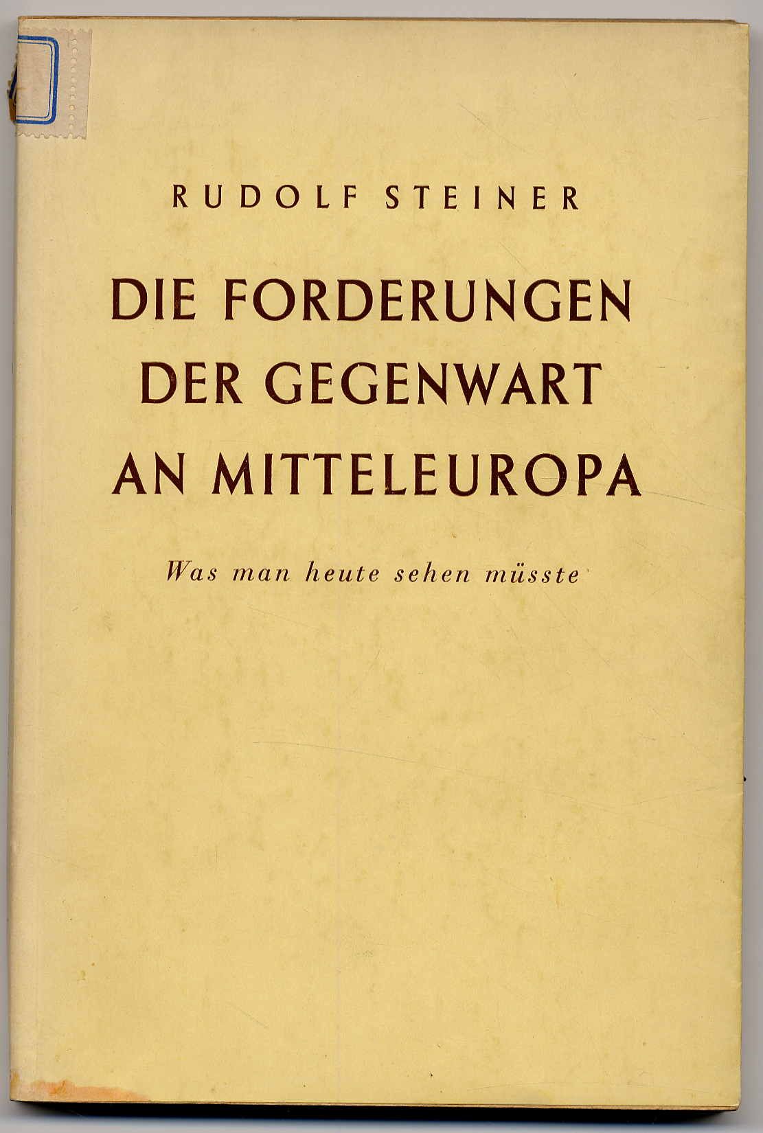 Steiner, Rudolf: Die Forderungen der Gegenwart an Mitteleuropa. Was man heute sehen müßte. Soziale und weltpolitische Aufsätze aus den Jahren 1919 bis 1922. Dornach, Im Selbstverlag hrsgg. von der Rudolf Steiner-Nachlaßverwaltung, 1951. Ca. 23 x 15,5 cm. VIII S., 175 Seiten. Orig.-Broschur. Handschriftlicher Nummernaufkleber auf Einbanddeckel, Nummer auf Vorsatz. Einband etwas angestaubt, sonst gutes Exemplar.