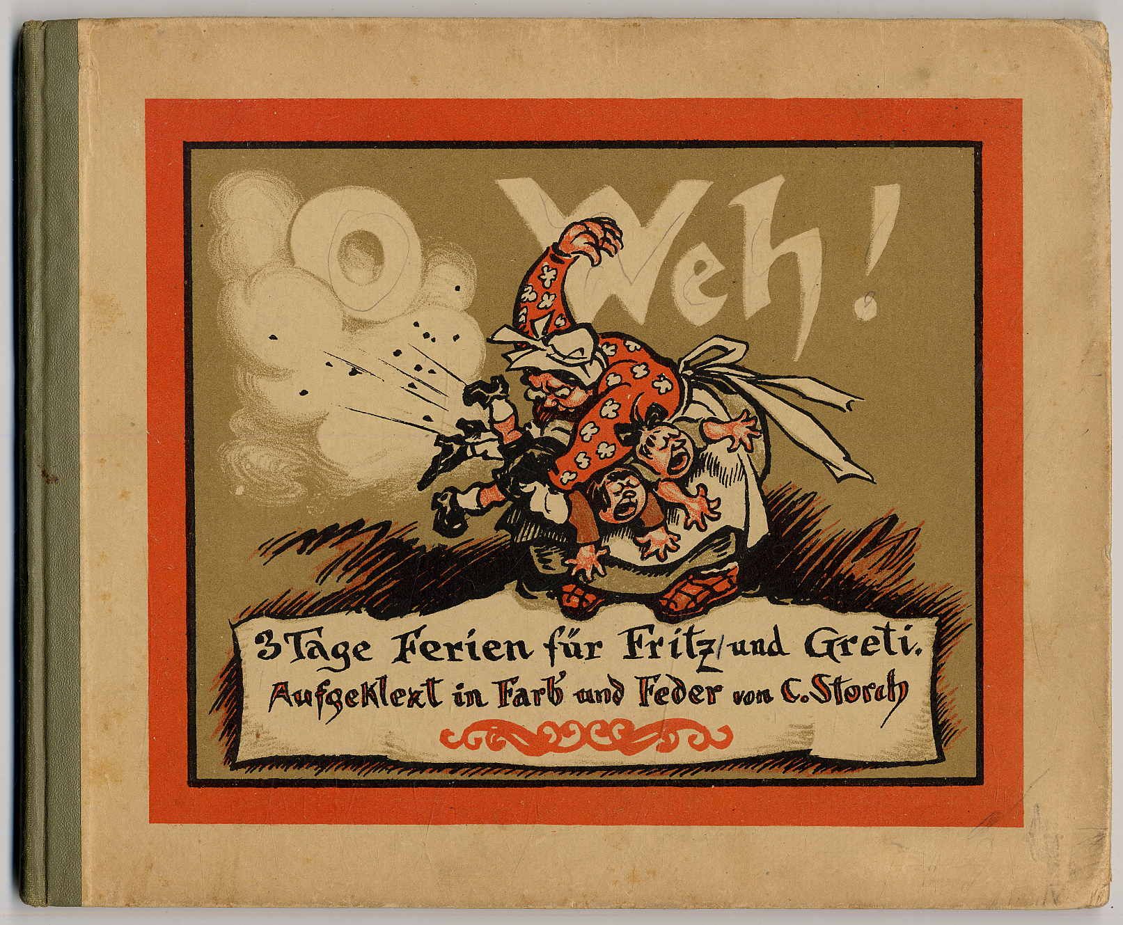 Storch, C[arl]: O weh! 3 Tage Ferien für Fritz und Greti. Aufgeklext in Farb’ und Feder. Wien, Österr. Bundesverlag, [1945]. Querformat, ca. 21,5 x 26 cm. (2) S., 49 Seiten. Mit Zeichnungen von Carl Storch. Farbig illustr. Orig.-Halbleinenband. Einband etwas fleckig und Kanten leicht bestoßen. Besitzvermerk auf Titelblatt (mit kleiner Fehlstelle) Max- und Moritziade. Rühle 1722b: „An 3 Tagen Ferien auf dem Lande bei ihrer Tante Frieda toben sich die Geschwister Fritz und Gretchen weidlich aus und spielen den Erwachsenen drei deftige Streiche, die in ebenso kräftigen Prügeln enden. Wie immer bei Storch schwungvoll illustriert, wobei Fritz und Greti im Gesichtsausdruck echtes Vergnüngen und Freude an ihren Streichen offenbaren, die Erwachsenen dagegen mitleidererregend und humorlos wirken.“