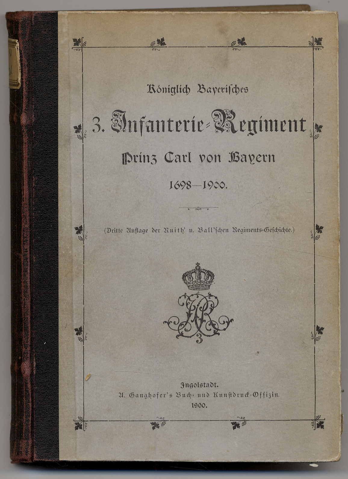 Königlich bayerisches 3. Infanterie-Regiment Prinz Carl von Bayern 1698-1900. 3. Auflage der Ruith’ u. Ball’schen Regiments-Geschichte. Ingolstadt, A. Ganghofer’s Buch- und Kunstdruck-Offizin, 1900. Ca. 20 x 14 cm. XIV S., 475 Seiten. Mit Porträt. Orig.-Halbleinenband. Einbandkanten bestoßen. Vorsatzblätter gelockert. Rücken mit Papieraufkleber. Stempel auf Titelblatt, Bibliothekeinträge auf Innendeckel. Seiten papierbedingt gebräunt.